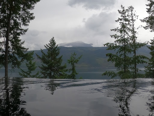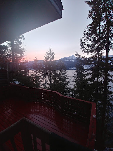 Had 4 days of complete luxury and quiet natural ambience at this chalet overlooking Arrow Lake.. When I say quiet I mean not a sound. No traffic, no boats, no people, and no cell phone. It takes a while to get used to the silence but after a day or so you begin to restore your natural balance and with the wonderful hot spring fed hot tub which was built into the chalet patio, you can begin to totally relax and reset from a normally hectic life. The view from the hot tub is the lake and mountains in the distance.