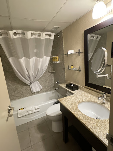 I stayed here for a week while attending a training course at NAIT, only a 10 minute walk away. Kingsway mall is directly across the road with shopping/food/entertainment. All the staff interactions I had in my week were top notch, they were all very pleasant and helpful while also coming across as genuine. Rooms are fairly priced, clean and have comfortable beds and nice fixtures and finishes. Very quiet building, even when booked full my room was quiet. However, roughly 1/2 the building has motel-style rooms (that is to say, the bathroom is in the rear of the unit and there is a door/window at the front) with a central hallway built out to connect all the doors. As such, the hallway has plenty of windows for light because all these rooms still have windows, they just look out into the hallway. As a result of this, I kept my blinds drawn for my whole stay, not wanting people to be able to look in as they passed by in the hallway. Along with this, the pool is in a bit of a weird spot. itâs right off the main lobby, meaning you must walk from your room all the way to the entrance and enter literally opposite of the check-in desk. The pool is nice, a little small but has a really fun water slide and hot tub. There is a Tim Hortons located in this hotel as well as the restaurant right above it, they have a $9 breakfast special for hotel guests. Had a great stay, would probably stay here again if I needed to be...
