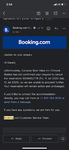 The issue is still ongoing. Different employees give different information and do not communicate with each other. I will also be reporting this to the Better Business Bureau. If you need your deposit back for the holidays, DO NOT STAY AT CANADA’S BEST VALUE INN CHINOOK.