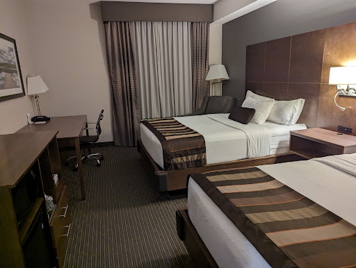 Read moreReception staff is friendly, wait times are usually short. Comfortable bed (only 4 standard pillows for a king size mattress) One AC outlet on each bedside lamp (which strangely had 2 switches, only the furthest of which was functional) One USB outlet on clock radio on one night table another behind the clock radio in the bed stand back board, one in desk lamp near telephone. Large flat screen HDTV with cable Efficient window heater/air conditioner. One cup coffee brewer with paper cups (ours was missing a leg underneath) not connected to an outlet under the TV. Mini fridge, Microwave. Room very clean. Recycle/trash bins. Nice ceramic wood-look tiling in bathroom and hallway. Modern quartz counter vanity in bathroom, luxury tiled glassed in shower with good spray head. Night light in electrical outlet beside bathroom sink was very appreciated during the night. Combo stable door for bathroom/closet door. Only 4 hangers in closet. Complete cooked breakfast with a variety of choices. Very reasonable hours. Promptly stocked and cleaned. Breakfast workers extremely friendly, helpful and kind. Carpeting in hallways a garish yellowish orange circle/grey stripe pattern. Does not represent the green of the brand or any rich design or texture. Probably the least attractive part of the hotel. Pool/hot tub not operational during our stay. No indication on website during booking or confirmation. Rudimentary Fitness Center with free weights and treadmills. Soundproofing of rooms from airplane noise is excellent. Sound from hallways carries easily, earplugs recommended for light sleepers (not provided in room). Airport shuttle leaves hotel every half hour on the hour, picks up at the airport 10-20 minutes later. Hotel must be called to arrange. Curious that the Wyndham Garden is only a building away, but they do not share a shuttle, I guess they’re independently owned. Teaming up would save fuel and staff, or possibly provide 15-20...