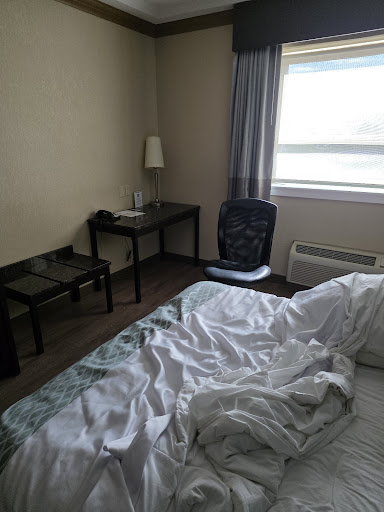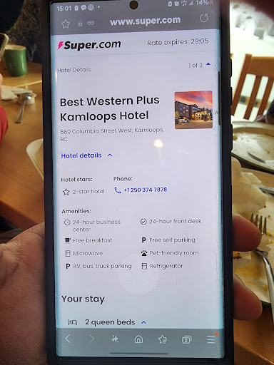 Read moreGreat continental breakfast! Sausages, scrambled eggs, pancakes, fruit, yogurt, cereal, toast, coffee, tea, juice etc! Cute breakfast area to sit and eat. The lobby also has a great coffee machine, free of charge for guests of the hotel. Pool was a little on the cold spot but a popular hangout spot in the hotel amongst the guests. There is a lazy river advertised online, but we could not figure out how to turn it on. After about 40 minutes in the pool and several other hotel guests going us, we noticed it turned on. I'm not sure if someone asked the front desk, as we definetly did not. The hot tub was a good tempature and overall both the pool & pool deck were clean. We shared shared a 2 bedroom queen room and were pleasantly surprised with how comfortable the beds were. Just soft enough with plenty of pillows and great comforters! The layout was nice and included a mini fridge and an in room coffee machine. The bathroom, like any hotel bathroom, was awkwardly laid out for as long as the door was open. Once the door was closed, the bathroom felt quite spacious. Plenty of parking but in a bit of a "odd ball" location. It is close to sahali mall which includes places like Bold Italian Eatery, Value Village, save on foods, with Tim Hortons and Superstore just across the street from the mall. If you are looking for a hotel close to the hospital, this would fit those guidelines however keep in mind its a steep walk back to the hotel from the hospital or anything downtown. Turning left coming down the hill and into the parking lot can be a bit time consuming depending on time of day as there is no light to follow to turn in so you are just waiting for the perfect break in traffic. The other gripe I hold is the quality of luggage carts. I'm hoping we just got the janky cart and the others were of sturdier quality but it made for a...