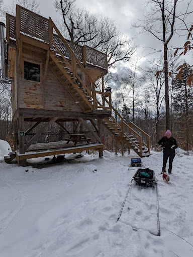25 min backroad drive from the main highway near Mont Tremblant you will arrive at Parc Eco /Refuges Perches - a protected wilderness environment. Check in was easy, super nice staff. Quite a few instructions to learn on arrival but they explain very well. You'll walk from the check in center to your treehouse by foot or canoe (optional in summer). The walk can be from 5 - 20mins depending on your treehouse. The trails in the forests are well marked and the walk sets the tone for the back to nature experience. You are provided with pull carts or pull sleds (when snow) to transport your bags and a welcome kit of essentials like a battery power pack, ice, firewood, water and other supplies which are collected from check in) Tip DON'T take too much luggage, you have to pull the carts yourselves which will get your heart beating. We took our own sleeping bags and pillows and some easy to cook food, books and music on our phones. We also had our small dog with us (dogs are allowed on leash) and she was enjoying every minute.