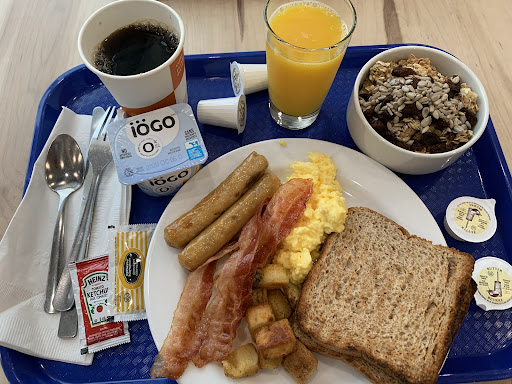 Breakfast was a highlight: delicious, included in the price, and plentiful. We especially enjoyed the waffles and yogurt, and there was a good hot selection too — sausages, scrambled eggs, bacon, and hashbrowns — all replenished promptly.