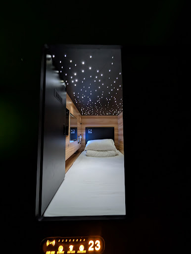 I had a great overall experience at this capsule hotel. The staff were friendly and helpful, and the stay exceeded my expectations. While getting into the capsule is a little awkward, it quickly became a cozy and relaxing space. I appreciated the minimalist design, especially the starry night ceiling, which added a unique and calming vibe. It didn't feel claustrophobic, which was a pleasant surprise.