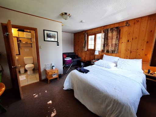 Read moreLocation was good, about a 10-15 minute walk to most things in town. Parking was close to the room. We stayed in one of the rooms in the main lodge, and we probably won't do that again. The room was very clean, and felt relaxing (decor, lighting etc). The kitchenette was useful, although a little more cutlery, and perhaps some basics like spices and cooking oil would be a nice addition. The gas fireplace added a nice ambiance and kept the room at a comfortable temperature. The seperate thermostat for the bathroom was also a very nice feature, since I like to sleep in a cooler temperature, but don't want the bathroom to be as cold when I have my morning shower. The TV was a little small for watching from bed, but most people aren't spending a lot of time in their rooms whilst in Jasper. Also no HD hockey, which added to the problem. The bathroom had a weirdly low counter. It had lots and lots of space, but it was low. At first I thought it was intended to be an accessible room, until I remembered we were on a second floor (stairs only, as far as I could tell), and saw that you almost have to pole vault in to the bath tub. The tub was certainly deep enough for a nice relaxing soak, though (hence the high wall). That, and the jacuzzi jets were the only reason we chose a room in the main lodge instead of a stand alone cabin. That being said, it -was- tough to climb in to the bath tub with jello legs after hiking 15+ Kilometers, and the jacuzzi was obnoxiously loud. I spoke with the desk attendant after our first night, and they did something that made it a little quieter, but it was still not worth the noise. I'm not usually a jacuzzi kind of guy, so perhaps they are all that loud - I'm not sure. The bed wasn't that comfortable (a little hard, not comfortable-firm, just hard), and there was a porch light that we had no control over, but it would shine in to our room and bed. I just took the bulb out so we could sleep. Our second morning, I had hot water for a shower, but then no hot water for dishes or for my wife to have a bath - that's a first for us in a hotel. All-in-all it would have been a decent stay, if the price was about half of what we paid. We have stayed in one of the cabins before (4-5 years ago), and were much...