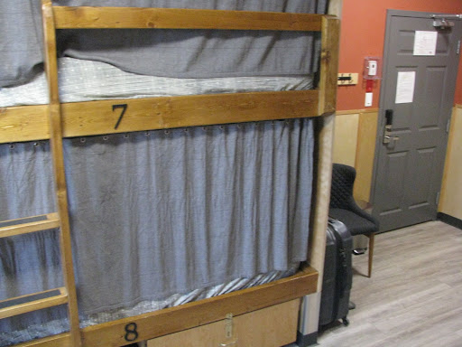 Beds come with a curtain for privacy, and feature a light, 2 USB chargers, 2 outlets, a little shelf to put stuff, and a couple coat hangers all in your bunk. I noticed that the number of lockers wasn't the same as the number of beds - not sure if that's because of COVID or not.