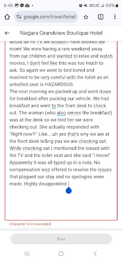 After this obnoxious encounter, it was impossible to enjoy the evening, our room or a much needed soak in the Jacuzzi we had paid a premium price for. The evening was completely destroyed. Ruined. We had to open all our windows and retire after packing up early knowing we would be leaving at first light. We dropped off our key and left with no breakfast - once a highlight at the Grandview - now reduced and bland as any of the other options available at any number of âMotor Innsâ - at a fraction of the cost. More disturbingly, our room was advertised as AVAILABLE for the nights of OUR stay on Airbnb for 30% LESS. Completely exhausted and upset, we just needed to go home without having to deal with an unpleasant, indifferent encounter with the owner.