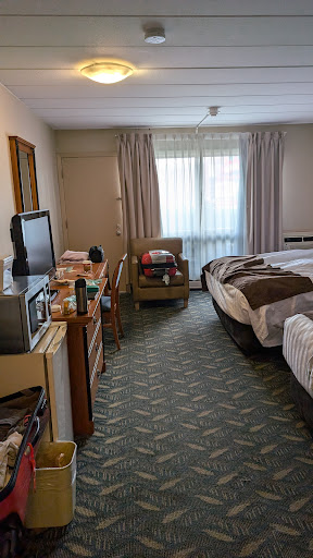 Went on a nice little overnight trip to Niagara with my family, upon entering the lobby we were welcomed by a employee who looked very very upset to see us and it wasn’t as welcoming as expected. In pictures of the hotel I saw a sign that said “FREE BREAKFAST” and I was disappointed with a $3 coupon per person to a very expensive restaurant with terrible options and horrible looking food. We had 2 rooms and one of the room keys just wouldn’t work no matter what, so I went down to get it fixed and the unhappy employee fixed it with a frown, it worked just one time until it stopped again, so yet again I went down and I was welcomed by a very nice lady (I wish I could remember her name) who delightfully fixed it and let me know to keep the key away from any phones as it would demagnetize it, the other employee could’ve told me that the first time but decided not to I guess, and this key issue never came up with any other hotels I’ve stayed at so it was a surprise but could’ve been avoided the first time I came down. Once we got into the room, we were welcomed by flickering lights and ugly bedding, the tv looked new but the video quality looked like it was from the 1950s due to the fact that all the channels were very static. The tables had weird stains on them and the bathroom had no heating. At night time I noticed blood on one of the pillows and a few hairs in the bed, I was hoping that they were mine but unfortunately the hair colour didn’t match length or colour and I was sure I wasn’t bleeding. In the morning I found out that our other room had bed bugs and my family was busy purging those little miscreants whenever they found any, I however didn’t notice any in my room. Anyhow I’m not much of a Karen so I didn’t complain about any of my other issues due to the fact that I was paying a really cheap price for this hotel so I couldn’t expect perfection of course. This hotel would receive a 1 star from me but it receives 2 mainly due to the only upside of this hotel, which is of course the location of the hotel. You have to just cross the street to get to the Ferris wheel and racetrack and only a 5 minute walk to the smaller side of the falls and a 15 minute walk to the main falls, and you can go into the city really easily without having to drive. I wouldn’t recommend this hotel if you’re trying to spend a night here but I guess it could be okay if it was slightly cheaper? Again, location was nice but the room was not it at all. Oh and by the way, that unhappy employee seemed like a manger to me, but I guess I’ll never know for sure since I will not be returning...