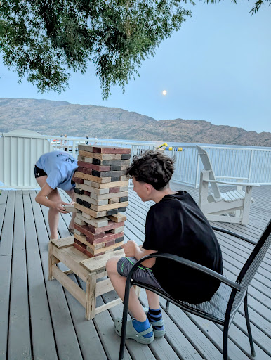 The dock seems to be pretty new and is a plastic type that didn't get hot or give you slivers so was nice. We didn't come prepared to fish but could see them so went to Canadian Tire in Westbank and bought a few dock rods. They had a line and reel for only $15 ea and worked great. We were out of province so bought 8 day fishing license online for myself and our oldest. Anyone under 16 didn't need one. We caught a couple fish both in the evening after it was cooling down.