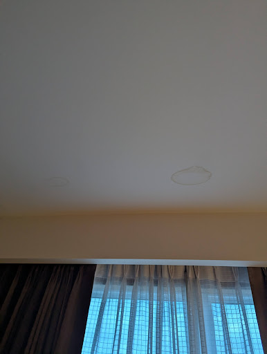 The breakfast room had two buckets on the floor catching water below huge holes from disintegrating ceiling tiles â clearly this is a problem with proactive maintenance which made me wonder about the potential for mold issues.