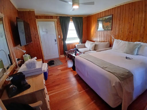 The room itself was spacious, recently updated, and very well equipped. We especially appreciated the deep bathtub, the cozy electric fireplace, and the kitchenette stocked with everything we needed — microwave, fridge, kettle, coffee maker, dishes, cutlery, even dish soap and cloths. The bathroom came with plenty of towels and a solid range of toiletries (shampoo, conditioner, body wash, soap, a massage bar, shower cap, and even a mini mending kit). Beyond that, the room had a queen bed, a pull-out couch, desk and chair, TV with cable, a ceiling fan, and air conditioning — really set up for comfort in any season.