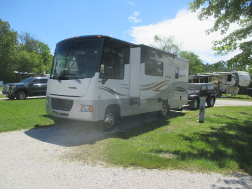 Our site, B1, was a pull through that was just long enough for our Coach and Towed. Services (30 amp, and water only) were to the left side. Distancing is fair for a rural park. Most sites had a vegetation privacy barrier. Each site has a table and a fire pit. Our site was flat and even. Overall the park was well manicured. Transient campers are parked close to the front thus some highway noise is present. Seasonal guests, and there are a lot, are farther back towards the river.