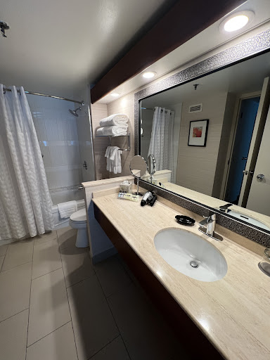 We found the layout to be quite impressive, featuring a spacious living area furnished with a couch and a chair. The suite included a wet bar equipped with a coffee maker, spoons, and glasses, as well as a refrigerator and microwave. We particularly appreciated the separation of the bedroom from the sitting area, which was enclosed by double doors. Additionally, the bathroom facilities were thoughtfully arranged, with the bathtub/shower and toilet situated in a separate room, while the sink area boasted an extensive vanity and drawers for convenient unpacking. The master bedroom is equipped with a flatscreen television, which is also present in the living area. Both the living room and the master bedroom feature room-darkening curtains, a beneficial addition for my daughter utilizing the pull-out couch for sleeping. The bed provided a comfortable sleeping experience, although it exhibited a slight sag in the area where I rested. Additionally, the carpet appeared somewhat dated, as did the wallpaper.