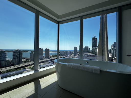 Read moreI’m on the fence, we were upgraded to a corner room with CN Tower views and a soaker tub; the stellar view alone was enough for a 5-star review from the very beginning, but over a few days, the cracks began to show. When I review a +$300/night hotel, I look at the details. The Delta has 3 bars, 2 of which are also restaurants. The 4th floor “roof top” SOCO restaurant/bar was nice and had a DJ that played a wide variety of music, but was a bit loud for what should be a relaxing environment, this isn’t a club. If this was late at night, I’d understand, but this was at 4PM and they had the music cranked to max. When we arrived at the front desk of this bar, the hostess acted surprised that we were staying at the Delta. It was a bit off-putting. The Char No 5 bar downstairs has a great staff; they were offering a plethora of information about various liquors to their patrons as we sat back and enjoyed the Blue Jays game from the bar with them. So, the two bar experiences canceled out, so no harm. Next up, we have the room. Hands down the best view we have ever experienced from a hotel room. The floor-to-ceiling glass in the room and washroom offered clear views of Lake Ontario, Toronto Islands, Billy Bishop Airport, metro/rail lines, Olympic Park, Rogers Centre, and CN Tower. Beautiful and plenty to watch in the day and at night. That said, the room had three critical flaws/oversights: The first was the orientation of the room’s air vent. The vent’s airflow is aimed directly at the thermostat. This leads to a pretty glaring issue where the thermostat does not know the actual temperature of the room as the cool air makes the thermostat believe its job is complete, leading it to turn on and off at short intervals, so the room never actually made it down to the temperature selected until we changed the thermostat fan to On instead of Auto, which helped circulate the air better and kept the thermostat more in check. Next, the vent, or lack-there-of, in the washroom. The shower caused the bathroom to get humid, as one would expect, but the room never vented properly afterward, so our towels never really dried out between washes. The lack of proper ventilation also led to ahem odors from the washroom not evacuating in a timely manner, so they would permeate through the room. Last, and this is the most critical, the soaking tub. Simply beautiful with a backdrop befitting a queen. However, tubs generally should not fill the entire bathroom with water. And, no, I am not insinuating that we allowed it to overflow. As soon as more than a couple of inches of water were in the tub, water would start leaking out from between the floor and the tub. We didn’t notice this the first time while in the tub, so one of us subsequently slipped and hit the corner of the sink pretty hard, leaving what became a gnarly bruise by the end of our stay. We brought the leak (not the bruise) to the attention of the staff via app, who offered to have someone promptly come fix it; we were ready for bed so we declined, soaked up the water ourselves, and asked that they come fix it during the next day while we were out, which they agreed to. The next day, after being out all day, we could smell an inoffensive chemical-esk aroma from the tub, so we assumed it had been worked on. We let is sit for the night so we didn’t damage any work that had been performed and tried it out the following night as we sat back to watch the CN Tower light show and the dome of Rogers Centre slowly close. Much to our surprise (but probably not to you, dear reader,) we found the entire bathroom had been covered in a thin layer of water yet again. During checkout, we reported the issue in person at the front desk to ensure that they did not put someone else in the room, the staff was very apologetic and even waved one of our bar tabs, a nice touch considering we did not go into the conversation expecting anything in return. With all that said, we will definitely stay here again, but I can’t give...