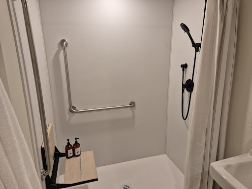 Needs to be fixed by either moving the location of the taps and shower head or the shower bench to actually be accessible.