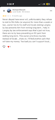 Iām half Indian and I also work in a blue-collar job. I donāt know which one was the āproblemā hereābut either way, it feels like discrimination. Maybe she thought we were too āredneckā for her RV park because we work in the trades. Or maybe it was because Iām half Indian. When I later looked through the parkās 1-star reviews, I found others reporting similar treatmentāincluding accusations of racism and people being turned away for reasons like being filmmakers. Thereās a pattern, and itās not a good one.