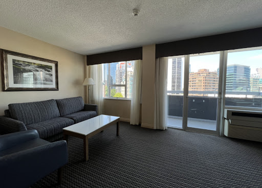 In general, I liked the hotel. There is not that much negative things to say about it. Originally I booked a Standard Room for 3 nights, but because of my requests (a room on a high floor with a nice city view, which they did not have at that moment) the front desk manager was very nice to me and upgraded me for free to a Suite. The entire front desk staff was very nice and friendly, by the way. My Suite (#802) was great! Its spacing was spectacular, like a whole 1-bedroom apartment. There was a little hall, a living room, a bedroom and bathroom. The design of my room was in classic Best Western Hotel style, nothing really fancy. The furniture in general was in good condition, but some pieces of furniture were old and crappy and they needed to be replaced. Also the sofa and carpets seemed dusty, they needed to be cleaned better. Like I mentioned before, I got the room on a high (8th) floor with a nice city view. There was a balcony off my Suite, which was a big plus. My room also had big panoramic windows, which gave a lot of day light inside. It felt nice to stay in the Living Room. It had 2 tables (one for working), a sofa, a big leather chair, a TV and refrigerator. The bedroom had 2 Queen Size Beds. They were very comfortable. Also there was another TV in the bedroom, plus, a little closet, a chair and a luggage holder. The little hall in my room had also a big closet. The bathroom looked remodeled. Everything there was in very good condition. I wish it had a little bit more space. Bathtub was a big plus. Unfortunately, the shower head did not work nicely, the water was spraying all over. I did not like the bathroom amenities, they were cheap and smelled awful. Another little minus was no toilet brush in the bathroom. Wi-Fi was working well during my entire stay. The hotel’s location is good. It is on a busy/party area of Downtown. There are a lot of shops and restaurants around. The distance to the water front is walkable. It is like a 12 min walk to Sunset Beach Park, which is a wonderful place to hang out and enjoy nature. At night the area where the hotel was located was very noisy because of some clubs and bars around. Last thing I want to mention is the rate I paid for the hotel. The price was approximately U.S. $270 per night. For a Standard Room I originally booked it obviously was a lot of money. For the Suite which I got upgraded to, this price seemed more reasonable. But in all honesty, this rate was still super overpriced for just an okay standard Best Western Hotel. In general, hotels in Vancouver for that period were super pricy, nothing cheaper then U.S. $240 per night. Nobody could explain why. Finalizing my review, I absolutely can recommend this hotel for a stay...