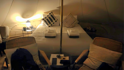 Unfortunately, we were delayed by a 7-hour road closure and didn’t arrive until 10:30 p.m. We were worried about arriving so late, but communication via email was swift and reassuring. When we finally got there, we found the site has one cabin and three tents. The cabin and one tent were occupied, so we crept in quietly, but the moment we opened our tent, we forgot how tired we were. Inside was the most stunning setup, beautifully styled and filled with thoughtful touches.
