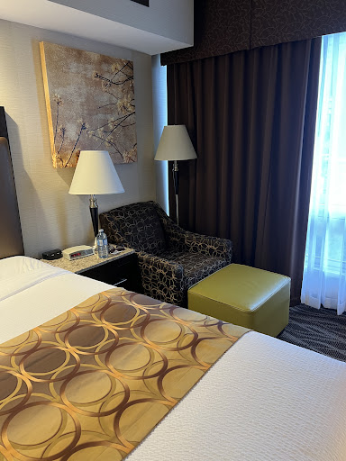 All and all, it was a good stay thanks to the front desk lady named May. She was great and very helpful. There was also another nice lady that was our server at O'Brian's for breakfast, and she was also really good. She was very nice towards us and was even making small take about where we were from and asking how our stay was going so far. The food and service was awesome. I gave her a tip for that day and the next day for the great job she was doing. (I forgot her name but she mentioned that she graduated in 1981.) Both ladies were very kind, thoughtful and caring towards us. Chase the bartender, on the other hand, was being rude on Halloween night towards me. He was doing his job, but I feel like he targeted me, He wouldn't serve me after my 2nd drink. He said "I'll see how you are after this 2nd one". I felt like my money was no good there. I finished my drink and left back to my room. He apologized a few days later after he over heard me complaining to my friend about the service I got from him. I would go back there but now it doesn't feel like the same happy place for wings and bulldogs. After ten years of supporting this establishment with my business, this is my only minor complaint. I hope I don't get awkward stares from him on wing night. Oh yeah, our fridge in our room didn't work so all our food went bad (room 103) and the bed closest to the washroom was slanted. Black widow drink special was awesome that I'm pretty sure we bought them out all weekend of there supplies to...