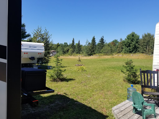 -3 hour drive from Hamilton great windy road on the Bunny Trail 25 kilometers, really test your skills easy to find watch for bushes rubbing trail as you drive in big turn around for my 59 footer by the office escorted to site 32 by owners long 100 foot site. our spot was a bit tight but it was the last one available water clean and at 20psi new 30 amp with good flow according to P.I. surge protector hard sand with grass fire wood $10 and delivered only 2 rental spots available rest are seasonal no gulf carts here. All ATVs, people are respectable riding them slow if ya don't mind the sound of engines once in a while lake is warm and swimable, sandy bottom dogs allowed to swim with you boat launch $25 with dock nice beach raft to swim to no bugs at this time of year cash or cheque payment @ $50 dark sky location owners are over friendly no watch dogs policing you no sewer but own will...