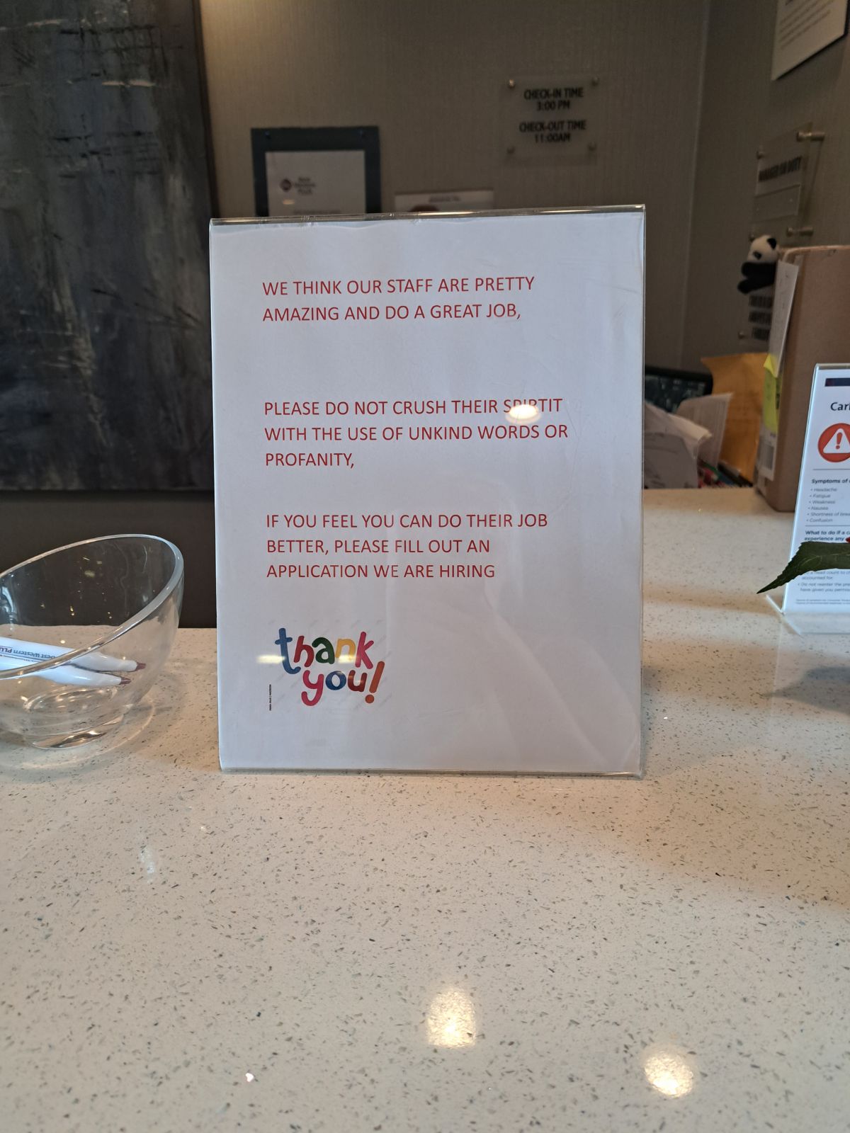 The concern we had was with the Saturday and Sunday front desk day staff. We called down at 7am on Saturday because the room above us was making a lot of noise (not just walking- jumping, stomping, running and screaming). We were told that she would give them a call. Nothing changed so we decided to go for breakfast since we were up. I asked the lady at the front desk if the people in the room above us were checking out and she rudely told me no and there was nothing she could do. She told me that the people in the room above us have a 3 year old and will do their best. We eat breakfast (horrible breakfast) and went back to our room to try to sleep. The banging above us continues (really really loud). We finally fall back asleep to have the phone ring. We ignore it. It rings again immediately after. My husband answers it. I am on the other side of the king size bed and can hear the front desk staff berating my husband. “It is unacceptable for you to be banging on the ceiling. If you don’t like the noise above you, you can get out of the hotel” my husband tries to speak with her but couldn’t get a word in. She continues yelling and hangs up. To be clear, we were not banging in the ceiling, we were in bed trying to sleep. We go out to do some shopping because we are very frustrated. When we get back, our keys to the room have been shut off. I asked one of the other staff who was cleaning a room if the keys sometimes stop working and she said “no. Only front desk can turn those off” So now, down we go to see the lady at the desk that has been of NO help and yelled at my husband. I go to the desk, get the keys reactivated, receive what I assume was to be an apology about the way she spoke to my husband and the she said “you must have had some coffee or something because you are in a better mood than earlier” The banging continued until almost midnight on Saturday and started again at 7am this morning. When we went down for breakfast this morning, the whole staff team was sitting in the lobby on break and was quite loud. Guests were trying to get coffee and ask for help and the staff wouldn’t get up and yelled instructions to the guests from the lobby couches. The only time they got up was when someone said angrily that the coffee was empty.