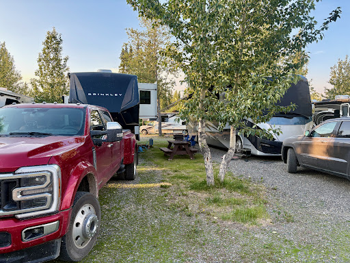 This campground is located right off the Alaska Highway (Alcan), about 33 miles east of Beaver Creek, YT. Check-in was quick and easy. Afterward, we were led to pull-through site 2 with full hookups by the friendly “running escort lady.” All the sites here are 30 AMP. The utilities were well-placed, roughly halfway down the gravel pad, and the site was more than long enough for our 40' fifth wheel and F-450. There’s grass and some trees between sites, offering a bit of privacy. Even with the tree cover, we were able to position our Starlink dish for a decent shot to the sky. That said, Starlink was a bit hit-and-miss in the afternoon—our speed test at 1:30 PM showed 69.6 Mbps down and 3.61 Mbps up. Water pressure was okay at around 35 psi. There’s no campground-wide WiFi, but you can connect at the office. We didn’t get any Verizon or T-Mobile signal here. This is an off-grid campground powered by a 24/7 generator. Due to an unusual heatwave and everyone running their A/Cs, they were having some generator strain. Guests with their own generators were asked to run them from 5:00 to 8:00 PM to help lighten the load. Everyone near us was more than happy to pitch in, though we’ve seen negative reviews—likely from folks who didn’t understand or care. Behind the campground is a massive grass field, sometimes used as a landing strip. We were told it’s fine to let your pups run loose out there, which our dogs thoroughly enjoyed. In Beaver Creek, the 1202 Motor Inn offers fuel, a small selection of sundry items like soup and basic groceries, and a gift shop with local souvenirs. Be sure to walk through the campground and check out the historical vehicles left behind from the construction of the Alcan. We stayed here for three days and really appreciated the warm hospitality of the staff. We wouldn’t hesitate to stay here again—and in fact, plan to stop back through on our return...