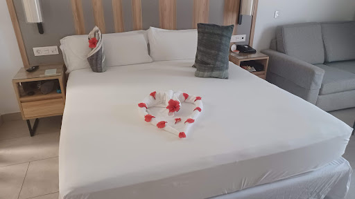 Read moreWe checked on line, but we still had to join the que to checkin. There is little benefit to this option. Room. The room is a good size. Our room was a long way from the pool area. The bathroom had dirty floors and stains on the toilet seat and bottom of the pedestal was stained. The shower door didn't close properly and the door seal was coming off/broken. Towels were not always replaced and had to ask for them. Bedding was overused with bubbly bits on the bed sheets. Again, had to ask for the sheets as they had only left one sheet instead of 2. There were hairs, stains and bits on the sheets. You could often find others peoples hairs on the floor. Floor in bedroom also not very clean. Mini bar was not restocked every 2 days as stated. Damp patches on the walls near the door. Dead fly in room which I had to remove as it had just been left my the maid. Pool. Getting to the pool area was a long way. At no point are you made aware how far it was to walk to the pools and beach. The pool area is dirty with stains on the floor around the sunbeds. This area never gets swept. This is from drinks being spilled and food being left. There are flies everywhere. The bars areas spray but there are many. You see dead flies all over the floors. The shower for cleaning feet from the beach is always full and with stagnant water. Men do try to get rid of the water but it back within a hour or so. Many of the sunbeds are ripped /broken and we fell through. Be aware. Many of the parasols are broken.