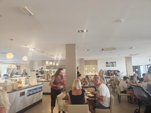 The main restaurant (serving breakfast, lunch, and dinner buffet-style, no reservation required) is small, noisy, and often lacks tables, with cleanliness leaving much to be desired. I must also mention situations when there was a shortage of plates, glasses, utensils, and I'm not talking about just one type, but all of them, so some guests resorted to putting food on saucers from coffee cups. Unfortunately, the waitstaff hardly clear dirty plates until guests are seated at the table; from what I observed, there are usually three waiters in the entire dining area. After guests leave the restaurant, the tables are wiped by the waiters with a cloth, or not at all. To find a nice, prepared, clean table, one must rather be among the first in the restaurant because later the tables are not properly set. Honestly, I wouldn't be surprised if soon guests themselves have to clean the table, set it, and then clean up after themselves and take the tableware to the dishwasher. The dishes are very monotonous, with many fried dishes. Drinks are not served to the tables; you have to personally go to the vending machine and pour a drink (you can choose from 4 types of juice, soft drinks, beer, and wine).