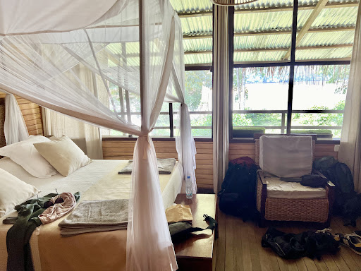 The rooms of the Lodge are simple, but comfortable. They are basically big wooden huts with a terrace, bathroom, a double bed and an extra one-person bed. The windows have mosquito nets, and there are also mosquito nets on top of the beds. The shower is cold water only - but this is not a problem with it being so hot all the time! Towels and soap are provided, but not shampoo.