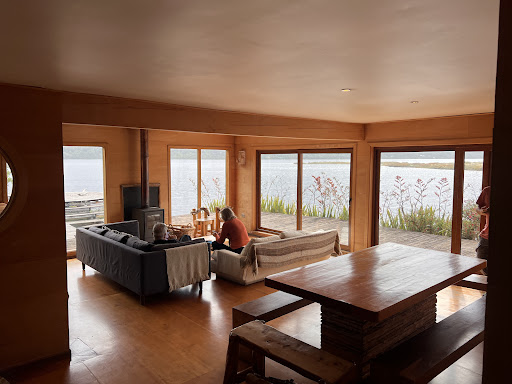 The palafito describes itself as a hostel,for linguistic rather than strictly semantic reasons I guesss. What I mean by that is that it is not aHostel to me in the English sense ,ie communal bedrooms austere, low cost etc but rather a boutique hostelry with anice sense of and spaces forcommunity above all it slows you right down it sits on a gorgeous lake with plenty of terraces to lolll around on, they provide sunloungers for the moments it stops raining in Cucao, you can be as active or lazy as you wish to be ( I think there are kayaks and guide for hire , or just slip into the lake for a swim ( I really regret not doing that as it had been raining, but so what’s new in Cucao the palafito Design is traditional( house on stilts but very contemporary ( beautiful ‚ blond woodland it is located on Cucao‘s Main Streetwith restaurants a mini market( no alcohol though) and as per usual in Chile somewhere to buy empanadas. Also just a quick Walk from the National Park Gate - you Must visit, there are excelllent paths, easy to follow and enjoy even in the rain, an enchanted forest withsome good exhibits on local traditions and explanations about the abundant flora and fauna of the region. However, the Park should invest in some Englishversions please. The palafito is easily reachable by local buses, we travelled all the way from Castro, which are higgledy piggedly but great fun because of the passengers‘ banter and, of corse, the street vendors who board from time to time with water super Ochoa’s and of corse empanadas - check out the macht’s con quest variety if you are lucky, totally delicious. Other excellent thingds about the palafito- good breakfast served by a good humoured crowd of local women, very nice and accommodating reception staff ( talking about you Guillermina! The only negative because of all of the wooden stairs and relatively open design it can get noisy at night, but the wonderful Ms G relocated us so that it became less of a problem. Altogether a fabulous stay- would go back in a heartbeat. Last bit of info, the palafito business partner Patriciorents out bikes and organisms horse rides - we rode to the Dunes well worth it. But make sure to take plenty of cash, not alll businesses accept...