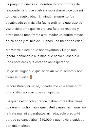 Con mucha tristeza haré esta opinión, ya que a pesar de algunas dificultades el hospedaje había sido confortable. 4 días y 3 noches por $170.000 app para 3 personas. Llegué el día sábado alrededor de las 3 de la tarde donde me atendió una de las recepcionista, muy amable, cordial dando la bienvenida, consejos y recomendaciones de dónde ir y teniendo en consideración que viajaba con un adulto mayor y una niña de 11 años. Todo el lugar bueno, sí hay cosas que debe mejorar: la ventilación de las habitaciones que son cerradas y no hay ventanas, las mesas para tomar desayuno (estaban cojas), el primer día no nos realizaron el aseo de la habitación, no nos cambiaron las toallas, ni sacaron la basura, ni hicieron las camas. El día domingo cuando llegamos muy tarde nos dimos cuenta que no estaba realizada la pieza, en fin, no me molesté, no me cuesta nada hacer una cama. El desayuno es un té o café, pan colisa con queso y jamón un pocillo con pequeños cereales y un yogurt. ¿Se podría haber esperado más del desayuno?, yo creo que sí, pero salvaba durante el día. El día lunes viajamos todo el día llegamos en la madrugada ningún problema ahí sí estaban las camas hechas y el aseo de la habitación. Hoy día martes 16 de julio siendo las 11:30 de la mañana me dirijo para desalojar la habitación y entregar las llaves, le pregunto a la niña que se encuentra en esos momentos llamada Karen que según ella es la "dueña" le consulto si puedo dejar mis maletas para poder pasear lo último que me queda, lo cual me dice que sí, que ningún problema, pero que se cobra $10,000 le dije lo voy a pensar y regreso. Nunca me han cobrado por dejar maletas solamente, iban a ser 4 horas, por ende tenía que pensar. Cuando vuelvo y le menciono que sí, dejaré las maletas, pero si podía cancelar cuando vuelva ya que estaba sin sencillo, me dice que NO!, que hay que dejarlo pagado altiro, pero su tono de voz no era amigable, algo déspota. Mi respuesta fue: ¿Pero cómo?, si voy a volver por mis maletas y le mencioné que nunca me habían cobrado por dejar las maletas. Siempre viajo y nunca me cobran. Empieza a responder de que por todo se cobra, que en donde vaya en todos los lugares van a cobrar, pero la verdad con un tono bastante desagradable, que sí, reconozco que me moleste y coloque caras y le dije: "Siempre viajo, nunca me cobran, pero está bien. Le pido los datos para tranfererir.... me los entrega y le consulto. ¿Dónde van a quedar las maletas?, me responde: Aquí, y después las dejo allá atrás. Ya una vez transferido el dinero, y disponiendo a dejar las maletas, le digo puede tener cuidado que tengo cosas delicadas, eran dos maletas (de las chicas), dos bolsas de súper y dos gorros diseñados de la tirana. Se molesta y me vuelve a subir el tono de voz y me dice bueno si no quiere dejarlas no las deje aquí, le respondo, que no hay problema (calmadamente) pero que solo tenga cuidado con los jockey. A lo que me dice que no, que mejor me lleve mis cosas y sale con: "Sabe que más le devuelvo su dinero y váyase" Estando presente mi madre y mi hija. Me molestó porque no estaba hablando con una empleada, estaba hablando con un huésped, donde yo pagué por estar en ese lugar. Y siemplemente estaba haciendo una pregunta, no la trate mal, ni le levanté la voz, menos la ofendí. Luego mi mamá intercede, dónde le dice que yo consteste mal, que mi actitud era mala y prepotente. Le volví a responder que solo estaba pidiendo que cuidara mis cosas nada más. Luego saca 10.000 en efectivo y se los pasa a mi mamá, lo cual ella no los recibe y en vez de mirarme a los ojos y entregármelos LOS TIRA EN mi jockey que tenía sujetado con mi mano y responde VAYANSE!, AQUI TODOS SE...