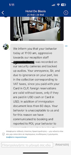we booked the accommodation at $159 with breakfast for 3 days! we arrived late at night the girl from the reception was waiting for us and asked us to pay upon arrival and that we had to pay $189 because we are with a card! we didn't remember the price, we went to pay! luckily for us the payment after 3-4 attempts was not made, until a Chilean couple came to check in and that's where the discussion about money and payment stopped! in the morning I went and paid $159 that the booking price said! at the same time a couple from Brazil came down who were staying for 6-7 days with their towels and they asked them to change the towels because they are now very wet from all the days .. on the second day that we needed them the girls from the reception came and helped us ! on the last afternoon as soon as we got down for the exit, the girl who had paid told us that there is a problem because I paid by card it is $30 more! I told her that I paid according to the price I booked and she showed me in the booking system my reservation $159 - 19% Chile tax $30.21 which is included in the price of the reservation ! I explained to her that because I have a hotel in my country and because I work with booking I know what she is showing me and that the tax is included in the price! she was adamant until I told her I will ask and if the additional charge applies I will pay! i headed to the police station i explained to them what has happened they asked for my passport they saw the date of entry into the country and they said i have no other obligation to pay anything else and that chilean law exempts travelers from the 19% IVA and if i want to complaint, but because I have a hotel I didn't want to continue! as soon as we got back to the hotel the girl I had paid made various ironic grimaces to the other colleague! the other girl also tried to convince me that I owe $30 more than the price I booked! I explained to them once again that I paid the price that was booked and I know the booking system because I have a hotel, and as I found out tourists from other countries are exempt from the 19% IVA! in the morning at 11 I went to check out the girl from the first night who went to charge me 190$ while I had booked with the booking 159$ she asked me for 30$ I explained to her that I have paid the price from the booking and the laundry 10$ , I don't owe anything and all the above from the beginning .. luckily for me it was an Italian tourist who immediately took part and told her that yesterday he paid the same amount in Valparaiso with a card and they didn't ask him anything more! to get the answer that it is the policy of the company! because I have a business, I want the customer to pay exactly what is due to him, neither more nor less! and no business would give the customer the $30 dollars! also because I had a woman across from me, there were cameras, I respected the space, I was also in a foreign country, I asked her to call the police and if I owe more, let me pay! there things took a different turn .. panic, fear and despair .. he called Manuel (if I remember the name correctly) to give the solution and to explain his to me persistently asking me whether I paid in dollars or pesos? as a European citizen using a well-known global travel card I told him that I paid in euros! he hung up on me I explained that I would rate the business 1 (and I'm sorry for that because I'm also a colleague) he started yelling that he's going to call the police! I told her I will wait! I waited until another colleague of hers came and politely asked me to stop here! I left and said I will not continue until I received the following message! P.S Manuel if you want to create goodwill in your business, you must find experienced staff with good knowledge of foreign languages! breakfast is not considered a spoonful of jam with butter for 2, 2 slices of cheese 3 salami, 0.65 ml juice and fruit in a glass blackened because they have been cut hours before! as well as changing towels, washing the bathroom and replenishing paper and shampoo must be daily! I wish you had brought the material to the police so we could see who would get...