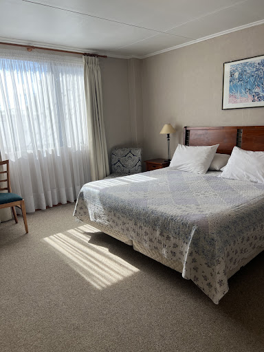 在此因為團體旅行需要兩個整天加上此地航班不多 必須住滿三天 費用3500+ 算是物美價廉 本旅館就在大街上,距離所謂武器廣場三分鐘,實際上小鎮繞一圈不超過一小時,非常悠閒清靜的小鎮,絕對有度假氛圍 天空地廓 這裡很少有超過三樓的大樓 都是普通木屋結構 餐廳與購物的店不少容易滿足旅客的需求 唯一的大超市在同一條街內 旅館類似汽車旅館改建 一個很大的汽車入口加上內部長條形設計 房間都分布在長條形內。唯一的兩樓與三樓房間都在前端外觀類似貓頭鷹房大大的玻璃眼睛 中央也是玻璃帷幕的外觀內部是大通道兼交誼區,每一個房間都有蒸汽暖爐的設置 這一點就讓資深室友十分享受 每天都有早餐 就在一樓的 入口旁 櫃檯就在門口對面 不一定隨時有人但進入必有信號,足夠內部人員應對 缺點是二樓只有樓梯沒有電梯大一點的行李只有自己可以處理,工作人員不一定可以協助 旅館的費用也包括早餐 因為行程關係 去冰川該日沒有蛋 相對來說 自助早餐 有穀物與牛奶 吐司 餅乾 另有火腿起司與優格等 基本營養就足夠