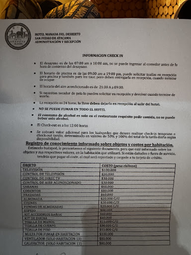 Read moreThis hotel was absolutely in the PERFECT location in San Pedro. It was a 3 minute walk to the square, a 3 minute walk to where we got the bus for the ALMA observatory, and conveniently located for just about everything. ||||The hotel arranged a transfer service from us from the Calama airport. It cost about $30ish USD per person round trip. I realized later that we didn't need to book it ahead of time, but it was nice to have it done, with no upcharge. ||||As other people mention, the rooms/bathrooms are TINY. You will not be lounging in the rooms, but since most visitors in San Pedro are out on tours anyway during the day, that's not really the goal of staying in the town. ||||The staff at the hotel were super friendly. Those who are there during most midday hours speak English well. ||||The breakfast that they served was ample and the hosts were quite friendly. ||||The pool was too cold for us to swim in while we were there. (I mean, I jumped in, but jumped right back out!!!)||||We were expecting the tiny rooms, but the things that made this less than stellar: We lost electricity a few times over the course of the stay. The last day, we couldn't shower because the water truck hadn't come to fill up their tank and they had no water in the whole complex. That put a bit of a damper on the last day.||||Overall, we were pleased with the stay and with our time in San...