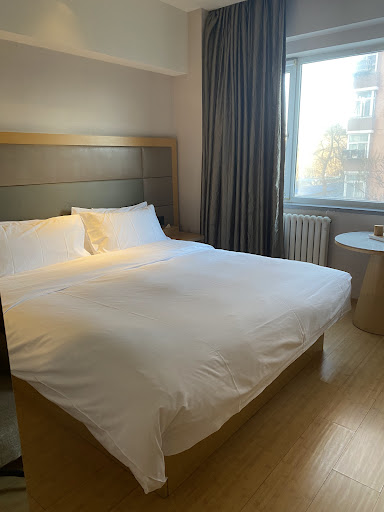 Read moreNote: This used to be a Hanting Express but is now Hanting Quanji or Hanting Seasons or Hanting Four Seasons. People still refer to it as Hanting. ||||I arrive at the hotel, green on the outside, with lattice-work over the windows. Walk down the steps into the lobby. On entering, people at the desk immediately greet me, though it is busy and I need to wait to be checked in. The lobby is large and cool white stone, with a few colorful cubes to sit on. There is a business center and breakfast area off to the left. Some pots of hot water, maybe tea are on the burner. I didn't check. ||||There are options for rooms. I have the discount rates, one can get with a 195 RMB Hanting Hotels card. The basic choices are between two twin or a single queen or king bed, superior rooms, business rooms (with computer), or ‘zero-pressure’ rooms. I am told the latter is better bedding. The standard queen room is 385 RMB with the 20% discount. Various upgrades are about 10 RMB more, so I opt for the ‘zero-pressure’ superior king room which is about 30 RMB more than the standard room. The basic rooms are probably pretty basic, and it is a cheap upgrade. I've often found the upgrades to be very worthwhile in China. ||||Reception service is good, and fairly fast. A regular guest praises the hotel but advises against getting the buffet breakfast. “You won’t like it”, he says. It is a buffet, Chinese-style breakfast. I might like it, but at 30 RMB it is expensive. I forget to ask about wifi, and the desk doesn’t tell me the password, so I have to ask later.||||I go to the single elevator and wait awhile. One elevator is rarely really enough, but it is new. I arrive at my floor, find my room and hold the key up to the lock. The green light comes on, and I open the door to a nice modern room. There is a card for ‘massage services’ under the door. Common in Chinese hotels. It is a fairly large room. I pop the key into the slot next to the door to turn on the power. Bright LED lights come on. There is a toilet to my left in its own room, next to that is an alcove with the sink, and behind that, the shower. There is a glass wall between the shower and the room, so no privacy had I been sharing my room. There is a chaise lounge under the window, and a large, king-sized bed. What are these pillows? Memory foam? And a memory foam mattress! This isn’t something I have ever seen in China. This is what they meant by better bedding. Along one wall is a low area for hanging clothes, some shelves, a place to put a suitcase, and a decent sized desk with several outlets. There are no enclosed spaces or drawers.||||Amenities are basic--2 free bottles of water, water boiler, hair dryer, shampoo/shower gel in bathtub, disposable toothbrushes, toothpaste and combs. ||||The view out the window is just of the street and a large building under construction across the road. The view is obstructed by the metal skin that has been added to it to make the building more attractive from the road. Part of the window opens and there is a pull-down screen. There is a thin shade and also heavy drapes. ||||On closer inspection, the wallpaper near the bathroom is stained and torn near the bottom, and the bathroom tiles are scuffed, but everything appears to be clean. I’m afraid the workmanship is not great, and the hotel won’t wear well, but for now it is pretty nice. ||||Everything works. The lights are bright, but I’d rather have a desk lamp and bed lamps for more directed light. There is a radiator and the heat is a bit too warm, so I use the electric heater/air con unit to cool the room a bit. The controls in Chinese are a bit hard to figure out. ||The shower turns out to be hot and have decent pressure, though nothing spectacular. Overall the plumbing works but doesn’t seem to be great. Towels are big but scratchy. No wash cloths, as is typical for Chinese hotels. ||||The first night I find the room to be a bit noisy. I even hear a bit of snoring through the wall. There is a bit of road noise as well. The second night is much quieter. I’ve stayed in many budget hotels in Beijing in the 300-400 price range. This is at the upper end, and is actually one-step up from the bottom of this budget chain. At heart, though, it feels like a budget hotel, kind of like a teenager a bit awkward in his best suit that doesn't quite fit. Still, it is the best value budget hotel I have found in Beijing, though I think sometimes one can get a similar deal on a more upscale hotel. ||||The neighborhood is not exciting, but there are plentiful restaurants and shops around and it is fairly central. ||||Reasons to stay:||1. Soft beds. Hard to find in China, especially at this price. Only in ‘zero-pressure’ rooms. This is a big deal. If you need a soft bed and like memory foam, and don't want to pay a lot, then this is probably the place for you. ||2. Location. Near Dongzhimen subway stop which includes the useful #2 line, less useful #13 line and airport express. ...