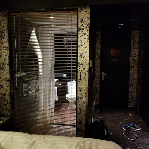 The washrooms are adjacent to the beds separated with a clear glass wall. There and blinds that block the direct view but someone on the bed side can easily lift the blinds exposing that natural nude individual showering for all to see.