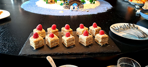 Peach blossom restaurant was great. The private dining room was premium top to bottom. Unlike a lot of higher end Chinese restaurants, the decor was not tacky, but simple, high end and elegant, much like the rest of the hotel. The food was premium with each plate using excellent quality ingredients throughout. All the fruit was locally grown in nansha, and genuinely you can taste the difference from say, typical street bought fruit, from Japanese grapes to fresh green Chinese jujube, which even in China (especially in the south due to the climate) is rare. Usually dates are eaten sun dried. I recommend the small square Napoleon cakes, whose taste was excellent and size not too big or small. The lazy Susan was self rotating, making it extra convenient when ordering lots of dishes with many people as we did. The tea, coffee and everything really, tasted great. If you ask really nicely, (maybe the general manager if you see him haha) you may be able to get a custom picture printed with cocoa powder on your coffee, through a picture on a phone. Staff were great, and were considerate so overall good service. Oh also, if you wish to arrive in proper class, arrive at the front gate in a blue tuk tuk. Only 10 RNB per person! It really was an experience and super useful in a rush from the local temple of the queen of heaven. Also the English breakfast tea was great. Lovely...