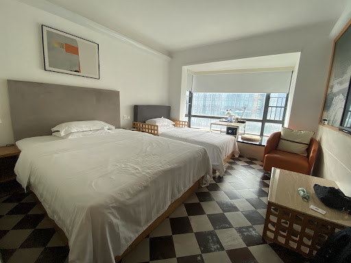 🚽 I know some want to find out: REST ASSURED YOU WON'T SEE EACH OTHER USING THE TOILET. THE GLASS IS VERY BLURRY!กระจกห้องน้ำขุ่นมาก คนข้างนอกมองไม่เห็นเวลาเข้าห้องน้ำค่า สบายใจได้ ☺️Great place to stay in Guangzhou! Located just at the heart of Tianhe shopping district, this hotel offered a very affordable price and a decent stay. I might consider to book it again if I had a second chance to go to Guangzhou. At first, as a group of friends, we were a bit concerned if the toilet design would have been too exposed (noise, smell, and visionary) after looking at the room's pictures. But It's far better than the picture! You can't see each other behind the glass (like some hotels), the smell didn't get out, but there could be some sound out. Overall it's really acceptable. The location is GOLD. You can walk to the famous Grandview Mall in less than 10 minutes as well as the cafe/dessert area of Tiyu Xilu behind the mall. Actually the malls near hotel, One Link & Shishang Tianhe, have a lot of great restaurants too. And it's near Guangzhou East Railway Station where you can travel to other cities, though there is not as many routes and trains as at South Station. More for the room and cleanliness:- Smaller than I expected, but still not too cramp for three people. - The building is a bit old and seems like it's in the same building with local/permanent residents.- safety is so-so. There's 2-3 securities I saw. - you can order the delivery and riders can deliver it to you right in front of your door.- no dust and the cleaning was okay- the building is a bit old, so as the room's light - but overall not bad. Very acceptableA big plus is the reception's hospitality!- they offered free bottled water every day. And you can ask for more at the reception. They are not strict. - they helped us reheat our takeaway food, using the staff's microwave....