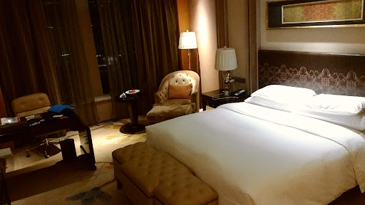 The room was very comfortable. It comprised a smallish TV, coffee/tea/kettle, room safe, bottled water, desk, comfortable chair. There was also an ironing board and iron. In common with many Chinese hotel rooms, there was a glass panel between the bedroom and the bathroom – it could be obscured using a blind if privacy was required. The large bed was firm. For reasons unknown, one of the windows had been left open, though there was no smell of smoke. Storage space was on the sparse side. The air conditioning was quiet and worked efficiently.||The bathroom had large containers for shampoo, body wash and conditioner. There was a small body lotion container and paper tissues. Toothbrush/paste were provided. Towels were soft and replaced daily. Water was always hot and plentiful. One feature I liked were the bright lights over the bat, making it easier to see when cutting my toe nails. The shower was separate from the WC. Another feature I liked was the shower had a short drying line which was great, allowing my washing to drip in the shower rather than on the bathroom floor.||I had breakfast, lunch and dinner at various times. They were all buffet style and had a wide range of western and Chinese dishes. The buffet restaurant tended to fill up quickly soon after opening.||It was fun to see white robots travelling around, up and down the lifts though it was not clear what they were doing.||The room was very near a large shopping mall and several good restaurants||The room was good but for the desk “collapsing” – one end of it had been precariously balanced on part of a narrow ledge. I left the desk lamp on the floor hoping it might alert the maid to a problem but my hopes were in vain. The desk lamp was left on the floor. As a result, I gave the hotel 4 stars...