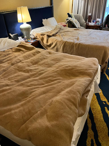 Room Condition: The rooms desperately need renovations to modernize their appearance. The table and chair are in poor condition, and the beds and pillows are uncomfortably soft. The overall room ambiance feels old and tired.