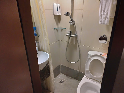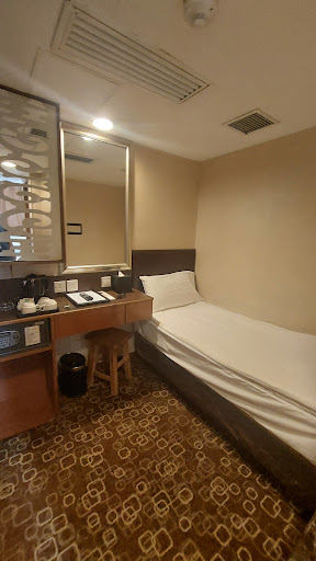 Read moreThis hotel is certainly not for westerners - the rooms are so small I can barely fit my luggage in the room, let alone unpack anything. My single room is about 4 m2 + 1m2 shower+WC: 2 of the single beds wouldn't fit in the room, the shower curtain sticks to my back while having a shower, and I can't fit on the toilet, the wall is too close. There are no compartments of any kind - I even had to utilize the space in the safe to store my stuff. Noise is terrible - I have trouble sleeping because the machinery around give a loud, randomly changing noise. The air is not very good - AC is working, but it either freezes me to death, or it won't de-moisturize the air. Cleaning is OK as hotels go around here, WIFI is working, but overused as usual. You can see the attached photo of what you'll see outside the window - the heavy curtain on it is there for a reason.