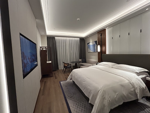 A very nice and spacious room with a comfortable bed and a great open view of the park and the mountains. The rooms have modern controls for the lights as well as motorized curtains, which made for convenience both when going to sleep and waking up in the morning. It was also nice that a phone charging cable with the three different adapters was provided. The bathroom is spacious and has a large sink and shower. It is nice that the shower has a choice of rainfall or regular nozzle. The shower controls were also very modern and you merely pushed the button for your preferred shower method. It seemed that the guest before me was unaware of this and had broken the temperature control and not reported it to the hotel. The front desk was quick to send a repair person who was very thorough in fixing the control. While the shower had good water pressure, it seemed at peak times that there was not enough hot water as the shower temperature was just slightly warm. To get a hot shower, I had to wait until late in the afternoon or late at night. The checkin was fast and the attendant was kind enough to honour my request for a non-smoking room on a high floor. The lobby is spacious with a nice tea area. It is also convenient to have a Starbucks inside the hotel. However, it was a bit noisy as other guests were not always mindful of the calibre of hotel they were in, which ranks in the 5 star category. It was difficult to try to get some work done with people playing videos loudly on their phones, talking on speaker phone or kids running around. This really took away from what should be a calming space. While the hotel attendants tried to maintain order, it really was a losing battle for them. The location is really dependent on what you are looking for. I found it nice to have the open park view but there are not many interesting restaurants around. For the middle eastern food, you need to bike about 1.5km. This was fine when the weather was good, but it was not convenient during the latter part of my stay when it rained all day. A few things to be aware of when booking. The breakfast was large with a lot of options but it really is a Chinese style breakfast. To call it Western and Chinese is quite misleading as there were only a few Western options, such as omelets. There is a great large screen television in the room, but only 2 or 3 English channels with the others in Chinese. There is a shuttle bus to the market, but it was a bit disappointing to learn that it only runs twice per day. The main area for the hotel to work on is its consistency of service. Some of the employees were outstanding but there seems to be a need for additional training. For example, the room came with a complimentary daily minibar, but I had to ask each day for it to be refilled. This was quite embarrassing to do, especially when the stocking was just some soft drinks with a single Tsingtao beer. Also, when I was in the toilet, one of the chefs walked out without washing his hands. While he may have washed them (hopefully) when he returned to the kitchen, he should be sure to wash them in front of guests. Lastly, the pool and fitness area seemed to require special access and the people working at the desk for the pool made me feel very uncomfortable when I wanted to see the facilities, so I just left and did not return. This was particularly disappointing because one of the reasons I booked the hotel was for these facilities. Overall it is a very nice hotel and I would book it again. But additional employee training would be appropriate so the service does not take away from what is a high...