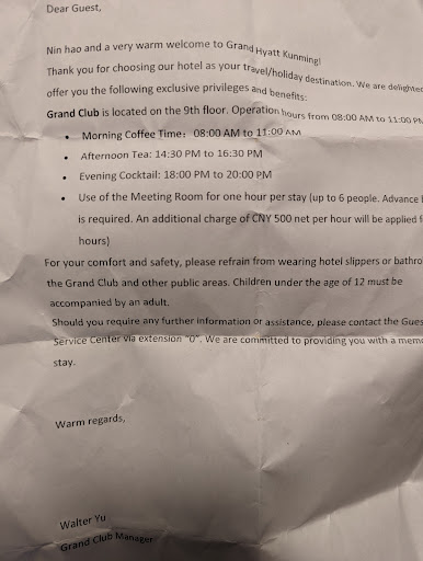 Read moreIts a brand new 5 star hotel worthy of being called GRAND Hyatt. The staff were all lovely and service was top notch from the check in experience right up to the check out. We arrived very early at 3am and was greeted by a lovely receptionist I think who was called Sami and despite the wee hours, there was a bell boy and Sami who ushered us in warmly to our new and very comfortable room.||The hotel has an excellent gym and a lovely 25m pool and a spa - facilities that is up to par with many paying gyms as the equipment were all very new and had a wide range Elsewhere, the visuals were stunning eg the entrance lobby and the other common areas were all tastfully decorated. Rooms were large with many modern touches eg washlets found in Japanese toilets and automatic blinds. The welcoming fruit platter was a nice touch. Perhaps it could have been a bit bigger to showcase the many different local fruits they have in Yunnan.||What was pleasantly surprising was the inhouse restaurants under chef Martin Aw Yong. Perhaps I may be bias, but we were very happy to meet Martin who was a fellow Singaporean and he recommended us to try the inhouse Japanese and Chinese restaurants. Both were excellent. The Chinese restaurant has the yummiest Peking duck with the the thinnest crepe/wrap and the other dishes we had was delicious - after a few days of sightseeing in Yunnan we were craving for something less"local"and a bit more international. ||The Japanese restaurant was surprisng very value for money and of a high standard too and we enjoyed two meals there. The manager Hank was very welcoming and service was impeccable. It opens till 2 am in the morning which is very useful as most places in Kunming closes around by 9pm. It has a lovely outdoor terrace which I imagine would be very nice in warmer weather.||My only feedback was that there should have been a bit more promotion and visibility on these restaurants because as a foreigner I was struggling a bit with the food choices and they were good options. As for the rooms, they were of a high standard , was very comfortable and we would not heistate to return if we are in...