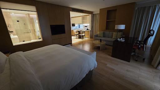 This was a 1 bedroom suite. Suites are very large, very comfortable, with all amenities you need. The bed is a delight, and the suite is very quiet so you never have any problem sleeping. Suites have an in-room thermostat. Very convenient to have an in-suite washer/dryer, in addition to the kitchen. The area is also very nice, very safe, with an array of convenience stores just at the foot of the building. There is also a shopping mall right beside the hotel but it is extremely expensive...only luxury shops. Dining options are limited at the mall too.