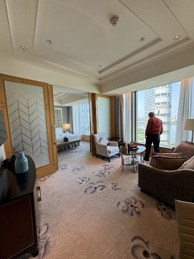 Bathroom: We were very disappointed with the bathroom. For example, in our bathroom (#3711), the bathtub top had been broken in two different locations and was poorly fixed with cheap plaster. Also, the panel on the side of the bathtub appeared to be loose/broken. In the shower, the shower fixture has been connected in a way that does not allow for the shower to spray forward unless the shower head was slightly unscrewed/loosened. Further, water would leak from the shower onto the floor outside every-time we took a shower, even though the door was fully closed. Also, for some unknown reason, there was a cheap plastic stool in the shower. What was that for? Despite staying in the suite, the shower was TINY! Barely 1m x 1m. The face mirror on the left side was loose/broken. For a suite, we were HUGELY disappointed with the bathroom experience. The purpose of our visit and selecting a suite was to relax. We were not able to relax! We don't recommend people to select a suite at Shangri-La Nanjing.