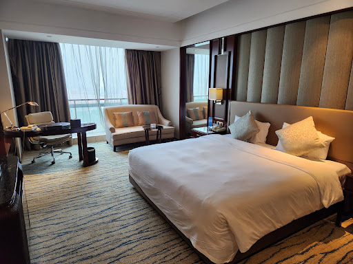 ย ย ย Read moreWe stayed at this hotel for a week in October as it was the nearest hotel to my sons apartment in Huangdao which is a district of Qingdao. Note that Huangdao is a long way from the centre of Qingdao at least an hour by car and up to an hour and a half on many journeys we took to Qingdao during my three week stay with my family.The traffic going into Qingdao is terrible.||||Back to the hotel,rooms are large,clean and well appointed.The restaurant on the ground floor where breakfast and a lunchtime and evening buffet are served can be very busy. We stayed during the Autumn holiday and it was chaotic,one of the managers really looked after us,finding,clearing and laying a table for us every morning.The buffet is extensive with Chinese and Western options and an omelette station. I didn't care for many of the Chinese options at breakfast or dinner but the restaurant really caters for Chinese guests and a few western business guests. During the Autumn holiday we seemed to be the only westerners staying in the hotel.The buffet at the nearby Hilton was better and the one at the Grand Hyatt in Qingdao was very good but of course a lot more expensive.||||We used the swimming pool nearly every day and my grandchildren where also able to use it.||||Service is good but staff need to improve their English if they are hoping to attract more western business guests to this new Economic and Technological district of Qingdao. We thought the hotel offered good...
