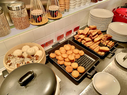 Breakfast was a small spread with basic necessities. Western and Asian items were offered, nice coffee and fresh yogurt and pastries, congee, eggs and so on.