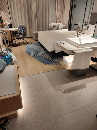 Read moreThe room was very modern, clean and big with an open plan design. The shower was nice and the bed was huge. Kettle, tea and plastic bottles but no water dispenser in the public area. Sleep quality was terrible for us. We always choose rooms with blackout curtains because we need complete darkness to sleep. However, there was a blue light switch on the mirror that was very bright, and you couldn’t turn it off. Apart from that the sound insulation is very bad. There was a robotic (or human I don’t know) voice talking in the room next to us almost all night and it didn’t stop until the time we had to wake up (3:40 am). The shuttle bus takes 35’ to get to the airport, it is not every hour but every hour and 20 minutes, so this did not work with our timing and we had to leave much earlier than we needed. It was a large bus that was packed when we arrived, the suitcase storage below was almost completely full and with great difficulty in the darkness (and tiny help by the driver standing next to me) I had to squeeze the suitcase in. Not a...