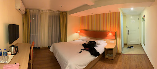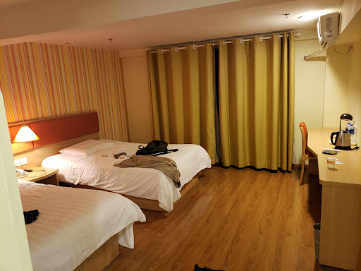 The toilet is a little old has water mold stains and there's not enough places to put your bag in the room. The carpet outside needs to be replaced. Vendors are on the trip outside till 4am most nights so it can be very noisy.The good thing is that there's a airport shuttle that leaves every hour in the morning, the driver is super helpful and friendly. There's a family mart and lots of restaurants outside including reflexology. Yangs dumplings just opened, so that's a huge plus there. Hopefully they will do up the rooms a little bit more, but really good value for airport...