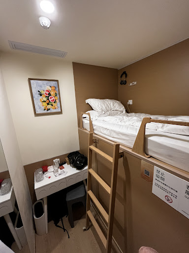 Read moreThis hotel is a gem. The location is perfect (less than a 5 minute walk to the nearest metro station and plenty of coffee and restaurant options in the area; count ~1.5h to and from PVG airport), the room and shared facilities (bonus point for the toilet paper that is better than many 4-star and 5-star hotels) are spotless clean, the bed is comfortable (different pillows are even provided), and the price/value ratio is almost unbeatable. There is even free tea and drinking water available.Please note that having taken the upper bed window room, packing a bag can be a challenge compared to the lower bed one I imagine. Also, all usb ports available are USB A.Few points can be improved: the windows let a flow of air coming in even if closed (the duvet is warm though), a little usb bed light would be useful (as it is not convenient to turn off the lights once in bed, have to do it before), the tv didn’t work in my case but that wasn’t an issue for me, the towels are disposable and normal towels would be a huge plus (pack a small towel should you want one), and lastly, whilst there’s no noise permeating in-between rooms, corridor movements can be easily heard (nothing that earplugs cannot...